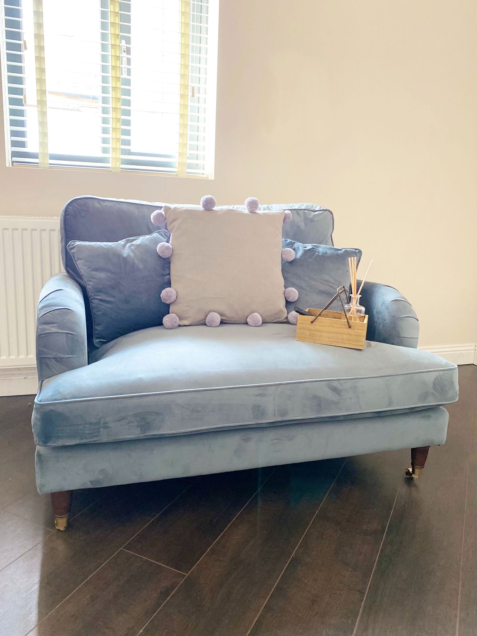 Grey square shape scatter cushion with fluffy pompoms. Add a fun touch to your sofa or chair with this modern, square shape scatter cushion. The cushion cover and insert are made from polyester and adorned with grey pompoms around all four edges. This cushion is suitable for hand washing only and features a full length zip on one side. Measurements: D3 x H45 x W45cm