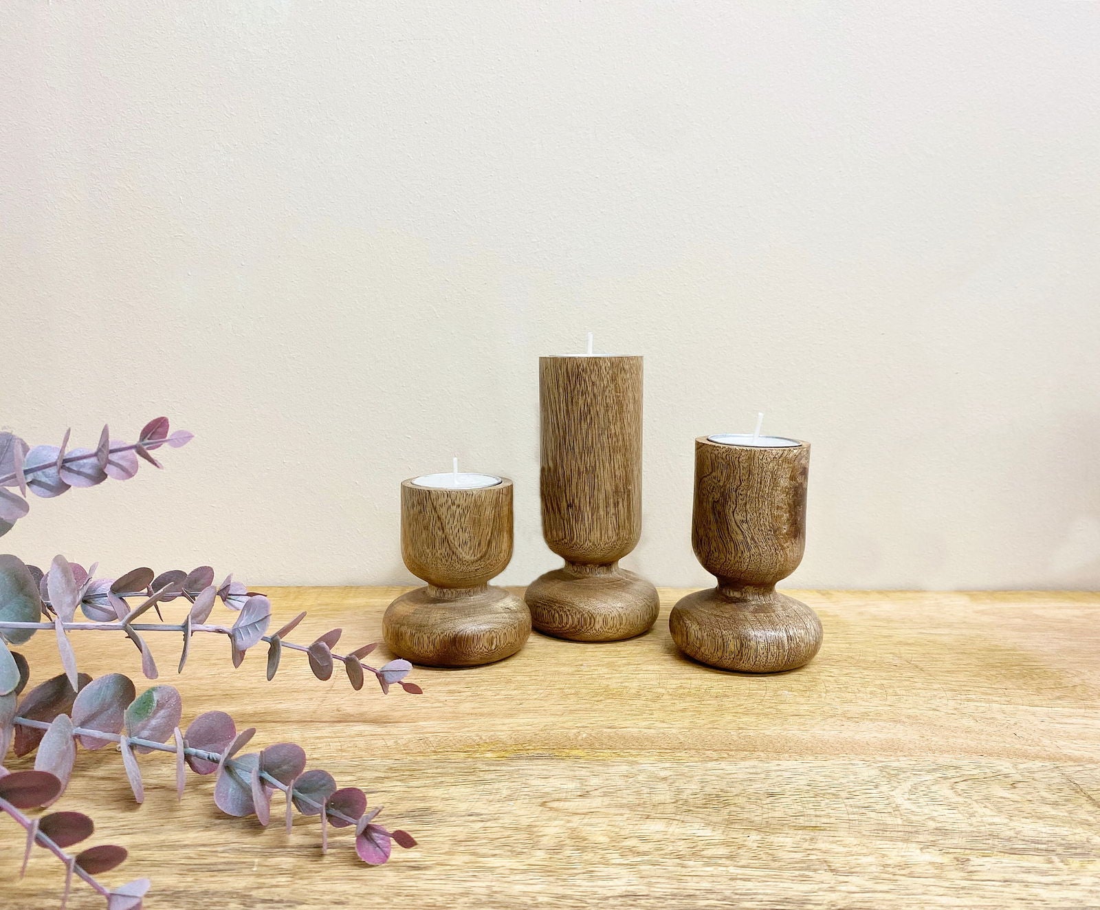 A set of 3 turned mango wood tealight holders (supplied). This items are beautifully crafted and have smooth waxed finish. Dimensions; small 6cm diameter 7.5cm high, medium 6cm diameter 9.5 high, large 6cm diameter 13cm high. All sizes are suitable for tealights or candles with a diameter 3.5cm. Measurements: D9 x H15 x W20cm