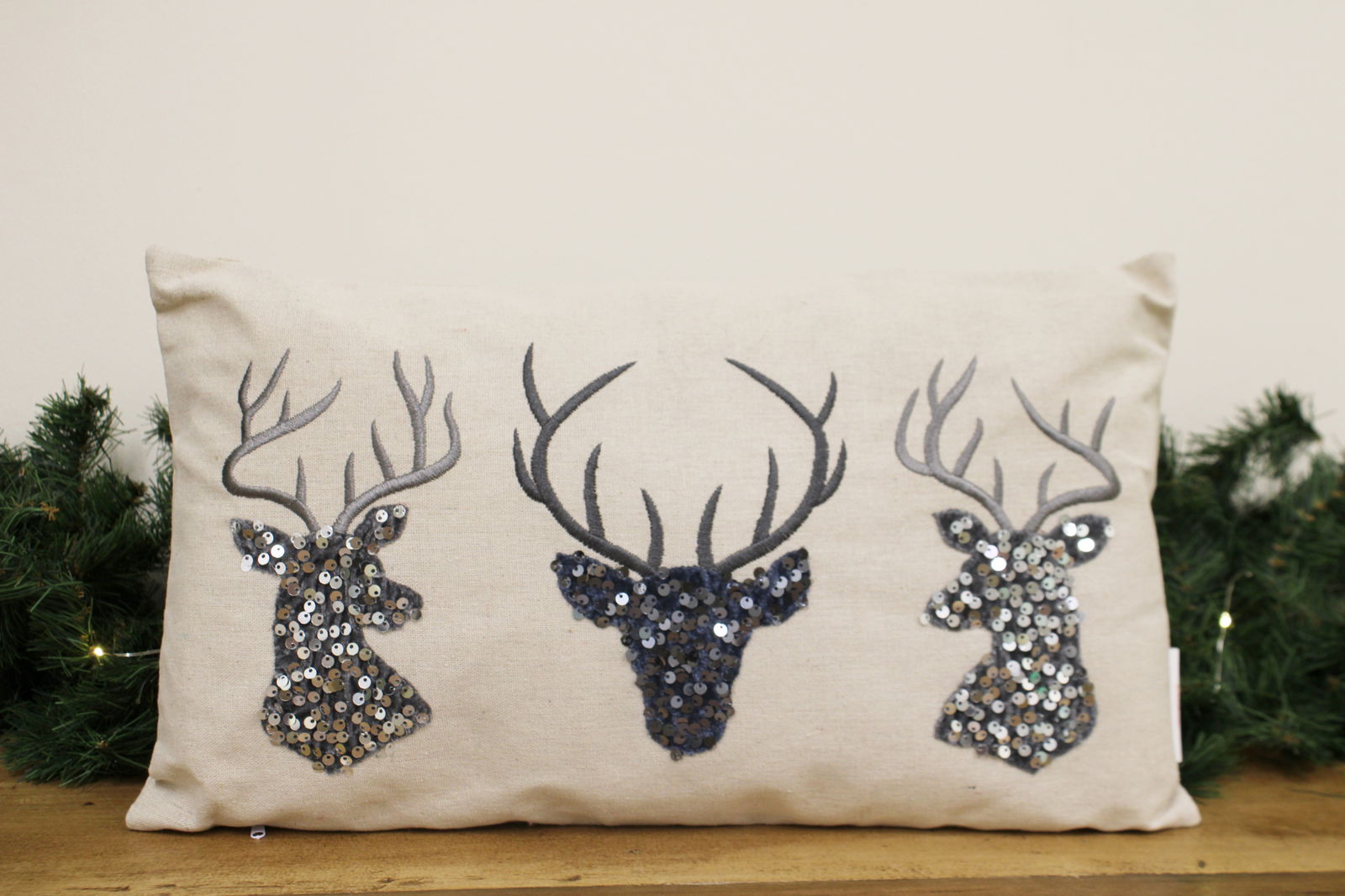 Sequin embellished rectangle reindeer scatter cushion. In a grey and silver colourway. Features a full length zip, cushion insert included. Perfect gift idea. Measurements: D12 x H27 x W47cm